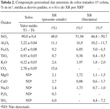 RESULTADOS E DISCUSSAO Caracterizaçao das amostras de solos e de XR As amostras de solos da primeira coleta e na profundidade de 0 - 5 cm, e as amostras de XR foram inicialmente caracterizadas por XRD, sendo constatada uma constituiçao majoritária de quartzo para todas as amostras de solo. Também foram observados alguns picos referentes à hematita (Fe2O3), berlinita (AlO4P), brucita (Mg(OH)2) e rutilo (TiO2), cujas intensidades dos picos sao reduzidas pela presença do quartzo (SiO2).33,34 O difratograma do XR apresentou picos referentes à albita (NaAlSi3O8), ortoclásio (KAlSi3O8) e carbonatos de cálcio e magnésio, além de picos característicos de quartzo. Alguns elementos foram determinados por XRF, sendo observados valores similares entre as amostras de solo (T1 - T6) e assim foram calculados os valores médios. Nesse caso foram utilizadas somente as amostras de solo da 1ª coleta (Tabela 1). Esses resultados bem como os resultados obtidos para o XR, todos expressos na forma de óxidos, sao apresentados na Tabela 2. Além disso, sao mostrados dois resultados da literatura para o XR, também da regiao de Irati, para fins de comparaçao.