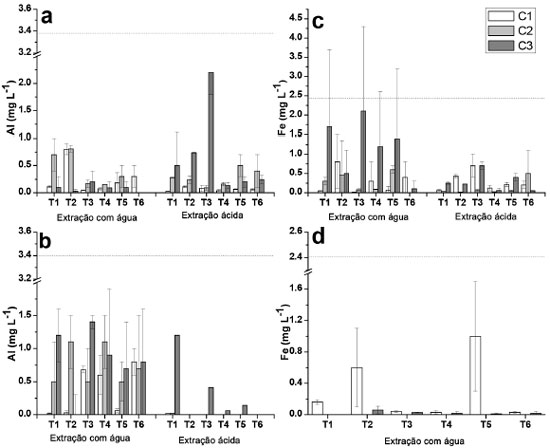 Figura 1. Concentraçoes de Al e Fe determinadas nos extratos aquosos e ácidos provenientes de amostras dos solos das profundidades de 0 - 5 cm e de 5 - 10 cm, para as coletas C1, C2 e C3. (a) Al (0 - 5 cm); (b) Al (5 -10 cm); (c) Fe (0 - 5 cm); (d) Fe (5 - 10 cm). A linha pontilhada indica o limite estabelecido pelo CONAMA25 de acordo com a Tabela 4