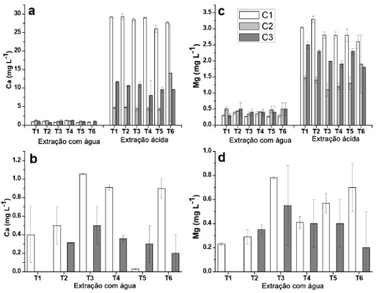 Figura 2. Concentraçoes de Ca e Mg determinadas nos extratos aquosos e ácidos provenientes de amostras dos solos das profundidades de 0 - 5 cm e de 5 - 10 cm, para as coletas C1, C2 e C3. (a) Ca (0 - 5 cm); (b) Ca (5 -10 cm); (c) Mg (0 - 5 cm); (d) Mg (5 - 10 cm)