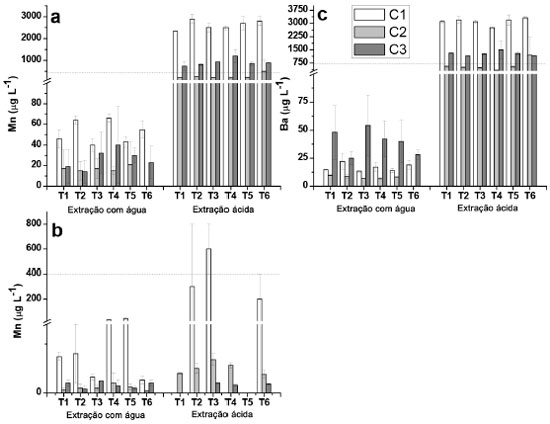 Figura 3. Concentraçoes de Mn e Ba determinadas nos extratos aquosos e ácidos provenientes de amostras dos solos das profundidades de 0 - 5 cm e de 5 - 10 cm, para as coletas C1, C2 e C3. (a) Mn (0 - 5 cm); (b) Mn (5 -10 cm); (c) Ba (0 - 5 cm). A linha pontilhada indica o limite estabelecido pelo CONAMA25 de acordo com a Tabela 4