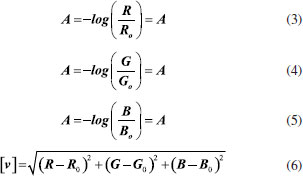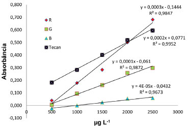 ![]() Figura 7. Concentraçao de fósforo (µg L-1) vs Absorbância. R: Equaçao 3; G: Equaçao 4 e B: Equaçao 5.