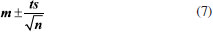 Depois de extrair os valores de RGB e exportar os dados para o Microsoft Excel, os valores de R, G e B podem ser exportados para a Tabela 1S, do Microsoft Excel, disponível em um link Google drive.25 Na Planilha do Microsoft Excel, os valores de R, G e B foram copiados para as planilhas 1, 2 e 3 respectivamente. Nestas planilhas, a média dos valores está na coluna D, os valores das médias de R, G e B foram exportados para as colunas A, B e C, respectivamente, da planilha 4. Na planilha 4, os valores de R, G e B de cada poço sao rearranjados de maneira a fornecer as curvas analíticas e a concentraçao de fosfato em cada um dos refrigerantes utilizando as equaçoes (3-5). As equaçoes de 3 a 6 sao as absorbâncias para cada um dos canais RGB, a Equaçao 6 é a distância euclidiana. ![]() Na planilha 4, os valores extraídos de R, G e B sao transferidos para as colunas R, S, T e U, a média (m) dos valores dos quatro poços que contém a curva de calibraçao sao colocados na coluna N, o desvio padrao (s) destes quatro valores na coluna O e o intervalo de confiança na coluna Q, o intervalo de confiança foi calculado com a Equaçao 7, em que n é o número de poços (n =4), t é o valor do t de Student, em um intervalo de confiança de 95% para três graus de liberdade (t =3,18), e s é o desvio padrao dos valores de RGB em cada poço. Como é ilustrado na Figura 5. ![]()