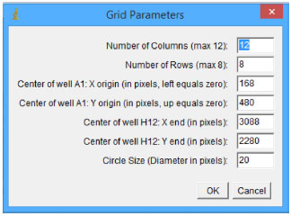 ![]() Figura 3. Janela Grid Parameters. Seleçao das coordenadas dos poços da microplaca