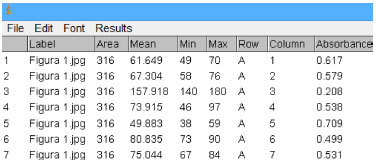 ![]() Figura 4. Janela results. Janela que mostra os valores de RGB para cada poço da microplaca