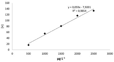 ![]() Figura 8. Curva de calibraçao obtida com a Equaçao 6 [v] vs concentraçao de fosfato