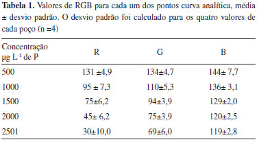 As curvas analíticas obtidas utilizando as equaçoes 3 a 6 sao mostradas na Figura 7, todas as curvas analíticas se mostraram lineares com um coeficiente de correlaçao (R2) maior que 0.96. Devido à pequena variaçao de B em funçao da concentraçao de fosfato, o coeficiente angular da Equaçao 5 foi pequeno (4 x10-5). Por sua vez, como os valores de R variam mais que os valores de G em funçao da concentraçao de fosfato, a Equaçao 3 tem um coeficiente angular (3 x 10-4) três vezes maior que a Equaçao 4 (1 x10-4).