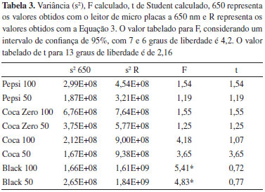 Utilizando um leitor de microplacas, o desvio padrao realtivo da concentraçao de fosfato nos refrigerantes foi de 12% em média, enquanto o desvio padrao relativo obtido com as imagens digitais ficou entre 23% e 30%. Por sua vez, o desvio padrao relativo obtido com a Equaçao 3 e Equaçao 4 foi de 23% e o desvio padrao relativo obtido com a Equaçao 6 foi de 30%. Portanto, optou-se por fazer a determinaçao da concentraçao de fosfato nos refrigerantes utilizando-se a Equaçao 3. Na execuçao da prática com alunos, os mesmos deverao escolher qual equaçao é mais adequada. Repare que na Tabela 2 o desvio padrao obtido com a Equaçao 4 é muito próximo do desvio padrao obtido com a Equaçao 6. As concentraçoes obtidas com o leitor de microplacas (n = 8) e com a equaçao 3 (n = 7) foram comparadas, inicialmente, utilizando o teste F para comparar as variâncias. Os valores de F obtidos para os refrigerantes estao mostrados na Tabela 3. Como é mostrado na Tabela 3, as variâncias obtidas com o leitor de microplacas e com a Equaçao 3, em um intervalo de confiança de 95, nao podem serem presumidas equivalentes para os refrigerantes: Guaraná Black 100 e Guaraná Black 50, visto que o valor de F crítico para 7 e 6 graus de liberdade foi de 4,2.