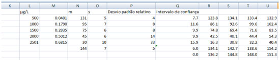 Nas colunas H-V, a curva analítica obtida com a Equaçao 3 está entre as linhas 2 a 7. A curva analítica obtida com a equaçao 4 está entre as linhas 27 a 33. A curva analítica obtida com a equaçao 5 está entre as linhas 51 a 57. A curva analítica obtida com a equaçao 6 está entre as linhas 74 a 79. A absorbância e [v] de cada amostra de refrigerante, assim como suas respectivas concentraçoes que foram determinadas utilizando-se as Equaçoes 1 a 4 estao entre as colunas G a Q e linhas 118 a 129, 132 a 142, 145 a 155 e 158 a 168, respectivamente. A concentraçao de fósforo em cada refrigerante, determinada com as equaçoes de 1 a 4, estao nas colunas H a L, respectivamente, nas linhas 174 a 181. A Figura 6 mostra como a concentraçao de P é calculada em cada um dos refrigerantes. A coluna F mostra que estas sao as concentraçoes calculadas com a equaçao 3, utilizando os valores de R. Na coluna G estao os nomes das amostras. Na coluna H estao os fatores de diluiçao de cada refrigerante. Na coluna J estao as absorbâncias de cada um dos refrigerantes utilizando-se a equaçao 3. Na coluna K está representada a concentraçao de P (µg L-1). Na coluna L as concentraçoes determinadas para cada refrigerante após multiplicaçao por seus respectivos fatores de diluiçao, por exemplo, um refrigerante que foi diluído 100 vezes, teve a sua concentraçao determinada na coluna K e este valor foi multiplicado por 100 na coluna L. Na Linha 119, P é o coeficiente angular da equaçao 3 e Q é o coeficiente linear da equaçao 1.