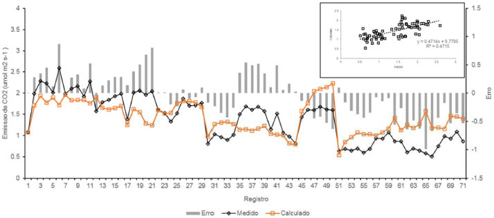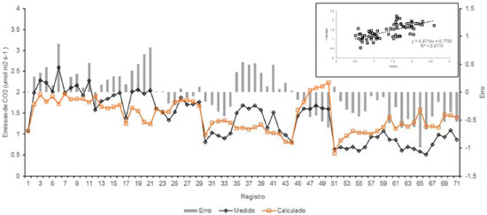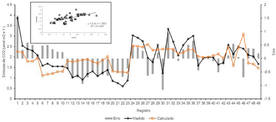 A existência de correlaçao entre a umidade do ar e as emissoes de CO2 foi observada no talhao 23 (r=0,28, p<0,055), e está possivelmente associada à conservaçao da umidade sob o dossel das árvores. Entretanto, a influência deste fator nao foi devidamente investigada nestas condiçoes, uma vez que em clima temperado a correlaçao negativa entre essas variáveis foi observada.35 A temperatura do ar apresentou uma correlaçao negativa com a respiraçao do solo (Tabela 2) nos talhoes 15 (r=-0,21, p<0,08) e 23 (r=-0,21, p<0,13), entretanto, sem nível de significância. Apesar da nao significância da correlaçao, o comportamento observado é inverso ao descrito em outros estudos, que mostram uma correlaçao positiva entre as emissoes de CO2 e a temperatura.14 A umidade do solo apresentou uma correlaçao positiva significativa com as emissoes quando analisados do talhao 23, enquanto no talhao 15 observa-se correlaçao positiva, porém nao significativa (Tabela 2), indicando que a umidade pode ser um dos principais controladores da emissao em áreas já reflorestadas. Essa correlaçao significativa, entre a umidade e a respiraçao do solo, foi observada por diversos autores, que justificaram o fato da regulaçao da atividade microbiana ser feita pela umidade, em decorrência das reaçoes químicas de decomposiçao da matéria orgânica.10,23,36 Quando acontece o aumento da umidade do solo, ocorre o aumento as atividades de degradaçao da matéria orgânica pelos microrganismos.36 Entretanto, baixos teores de água no solo afetam a difusao de solutos, enquanto solos saturados afetam a difusao de oxigênio. Ambas as situacoes podem limitar a atividade microbiana e, consequentemente, a respiraçao do solo.37,38 A relaçao C/N apresentou correlaçao linear positiva com as emissoes no Talhao 15, que acabou de ser reflorestado. Releva-se que as emissoes nessa área possuem pouca influência da respiraçao das raízes das plantas, e possivelmente a quantidade de carbono e nitrogênio no solo podem ser determinantes para a quantidade de CO2 emitido. A correlaçao linear positiva observada entre a emissao de CO2 e o horário da mediçao no talhao 15 deve-se, possivelmente, à incidência direta da luz solar, resultando em uma maior emissao nos horários de maior sol e, consequentemente, de menores umidades e maiores temperaturas do ar. Regressao linear múltipla Apesar da observaçao de que inúmeras variáveis sao correlacionáveis às emissoes de CO2 medidas nas duas áreas, nenhuma delas é capaz de prever satisfatoriamente os valores da respiraçao do solo independentemente. Portanto, a regressao linear múltipla é a ferramenta estatística para buscar a previsao e uma variável dependente, quando esta apresenta correlaçao com diversas variáveis independentes, que pode ser aplicada nesse caso, pois as áreas estao instaladas sobre o mesmo tipo de solo e regime climático. Para se avaliar a capacidade de as variáveis independentes selecionadas preverem a emissao de CO2 pelo solo na área plantada em 1916 a partir dos 49 dados, estimou-se uma equaçao de regressao linear múltipla utilizando o software BIOSTAT 5.0.33 Para a elaboraçao das regressoes foi utilizada a temperatura do ar, pois apresentou melhores resultados na regressao que a temperatura do solo. As variáveis aleatórias utilizadas sao a temperatura e umidade do ar, pressao, relaçao C/N e umidade do solo. A análise dos resultados indica, em nível de 0,05 de significância, que é possível rejeitar a hipótese de nao haver regressao, isto é, o modelo é válido uma vez que o valor p = 0,0011 é menor que 0,05. Dessa forma, conclui-se que pelo menos uma das variáveis explanatórias está relacionada com emissao de CO2 pelo solo na área do talhao 23. Apenas a variável independente umidade do solo apresentou correlaçao no nível de significância de 0.05, com coeficiente positivo. A pressao, a temperatura do solo e a correlaçao C/N apresentaram o coeficiente negativo, porem, nao significativas. O valor do coeficiente de correlaçao do modelo é bom (r=0,62), entretanto, o coeficiente de determinaçao ajustado é baixo (r2=0,31), indicando que apesar da proporçao da variaçao da emissao de CO2 explicada através do conjunto de variáveis explanatórias (Figura 2), o modelo é falho ao estimar valores que nao se encontram próximos a média, indicando a possível ocorrência de valores "outliers".