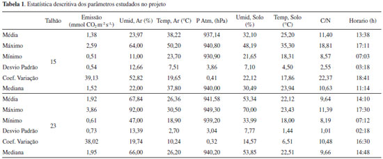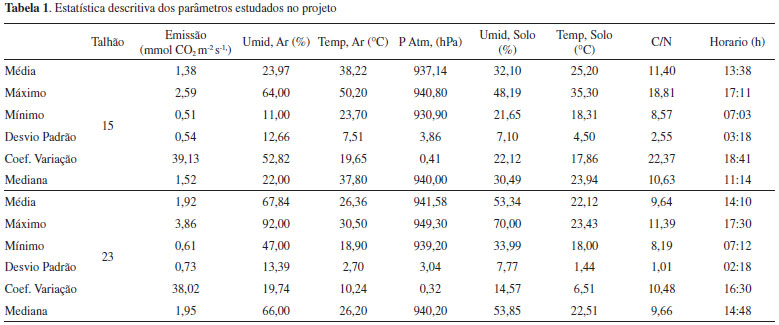 RESULTADOS E DISCUSSAO Descriçao dos parâmetros estudados no projeto Os valores de respiraçao do solo, registrados durante a execuçao deste projeto, variaram entre 0,51 mmol CO2 m-2 s-1 e 3,86 mmol CO2 m-2 s-1, com valor médio de 1,63 mmol CO2 m-2 s-1. Observou-se, de maneira geral, que as emissoes de CO2 medidas no talhao 15 foram menores que as medidas no talhao 23, com variaçoes respectivamente entre 0,51 e 2,59 mmol CO2 m-2 s-1 (média de 1,38 mmol CO2 m-2 s-1) e entre 0,61 e 3,86 mmol CO2 m-2 s-1 (média de 1,92 mmol CO2 m-2 s-1) (Tabela 1). 34