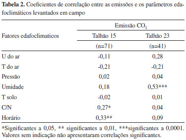 Essas diferenças observadas podem ser associadas ao tipo de cobertura existente em cada uma das áreas. Enquanto no talhao 15, reflorestado em 2014, a cobertura é caracterizada basicamente por espécies gramíneas, que haviam sido dessecadas antes do período de coleta de dados, resultando em espessa camada de palha sobre o solo, associado à pequena quantidade de raízes no solo, no talhao 23, reflorestado em 1916, foi observado que o estado de regeneraçao florestal é avançado. Na área está presente um denso sub-bosque, com indivíduos arbóreos estabelecidos no dossel da floresta e funçoes ecológicas reestabelecidas. Consequentemente, verifica-se uma quantidade de raízes maior, presença de serapilheira e melhores condiçoes físico-químicas e biológicas do solo. As variaçoes observadas para as variáveis edafoclimáticas (Tabela 1) indicam que as maiores médias para os parâmetros umidade do solo e do ar, da relaçao C/N e da pressao atmosférica foram medidas no talhao 23, enquanto que no talhao 15 foram registradas as maiores médias de temperatura do ar e do solo. As variaçoes observadas nos parâmetros físicos e químicos do solo (relaçao C/N e umidade) podem ser associadas às características distintas das duas áreas, enquanto variaçoes nos parâmetros climáticos estao associadas às datas distintas da realizaçao dos levantamentos em cada um dos talhoes. Emissao de CO2 e as variáveis edafoclimáticas medidas Correlaçoes existentes entre as taxas de emissao de CO2 pelo solo e variáveis ambientais foram observadas por diversos autores.5-14 As diferenças na cobertura vegetal das duas áreas refletem-se nas correlaçoes entre as variáveis e os fluxos de CO2 pelo solo (Tabela 2). Enquanto no talhao 15 as taxas de emissao de CO2 do solo apresentaram uma correlaçao linear significativa com a relaçao C/N (r = 0,27, p < 0,05) e o horário de mediçao (r = 0,33, p < 0,01), no talhao 23 se observa a correlaçao linear com a umidade do solo (r = 0,55, p < 0,0001).