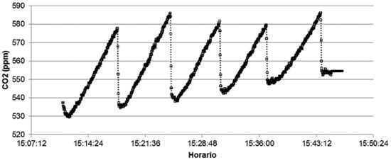 Figura 1. Mediçoes dos fluxos de CO2 efetuados em campo. Observar o aumento das concentraçoes, indicando que a câmara estava fechada. As quedas bruscas nas concentraçoes indicam a abertura da câmara