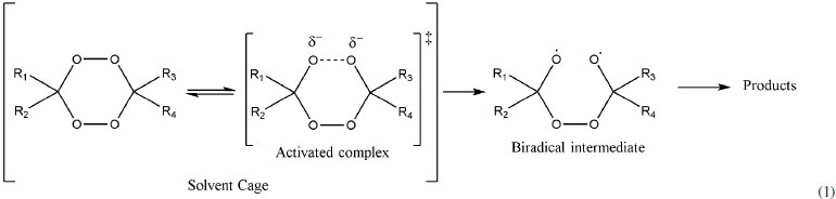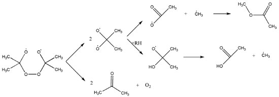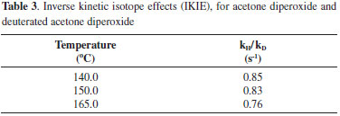 CONCLUSION Cyclic organic diperoxides derived from acetone and deuterated acetone (ACDP and dACDP) follow a pseudo-first order kinetic law during their thermal decomposition reaction between 140 to 165 °C. The first step of the reaction mechanism is the formation of a biradical species which later decomposes to give some reaction products (2-propanone, acetic acid and methyletanoate). These products support the postulation of the radical step mechanism. The reactivity of both compounds was compared at different temperatures. The temperature effect on the rate constant values demonstrated that the deuterated acetone cyclic diperoxide decomposes faster at all temperatures and revealed the occurrence of the enthalpy-entropy compensation effect for both peroxides. Probably those variations are due to substituents effects which in the present case derive from isotopic effects. Higher masses of deuterated substituents probably affect the stability of the tetraoxacyclohexane ring favoring the O-O bond rupture and the formation of the reaction products. Also, an inverse kinetic secondary isotopic effect is observed (kH/kD <1).