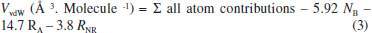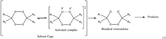 The initial peroxide concentration is relatively low to avoid effects of induced second order decomposition reactions that would accelerate the thermal decomposition of the peroxides at higher conversions. The reactivity of both compounds was compared at different temperatures (Table 1), observing that in all cases dACDP decomposes ca. 1.2 times faster than ACDP. In general, the high decomposition reaction rate of some organic cyclic peroxides is probably associated with the large size of the substituents. Thus, once the ring is opened through the initial O-O bond (Eq. 1), the intermediate species formed would adopt highly stable conformations within a new reorganized solvent cage that prevent the recyclization process from occurring. Consequently, the reaction progresses with the decomposition of the initial biradical to form the detected reaction products with high values of kexp. The van der Waals volumes for both cyclic organic peroxides were calculated according to the expression deduced by other authors25 (Eq. 3) using the data in Table 2: ![]()