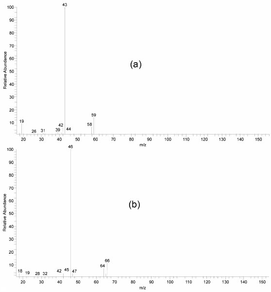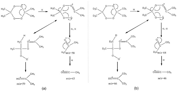 ![]() Figure 2. Mass spectrum of acetone derived diperoxides: (a) ACDP and (b) dACDP