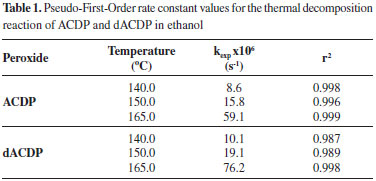 The dACDP was characterized by another author by Raman and FTIR Spectroscopy.10 In this work, the mass spectrums of the totally deuterated substance were obtained in order to complement the existing data and to confirm the assignment of bands. Kinetic analysis The thermal decomposition reactions of dACDP and ACDP were studied in ethanol solvent at initial concentrations of ca. 10-2 mol L-1 and at temperatures between 140 and 165 ºC (Table 1). The kinetic behavior observed in both cases follows a pseudo first order kinetic law up to at least 86 % peroxide conversion.