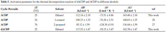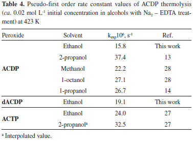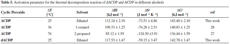 In the whole range of temperatures studied for the thermal decomposition of both peroxides, it is observed that dACDP has a higher reaction rate than ACDP (Table 1). Thus, the relation between the rate constants of both compounds is less than 1 (kH/kD), so that the existence of an inverse isotope effect can be postulated. In this case the reaction is initiated by the rupture of the O-O bond to form the intermediate biradical and the rupture of the C-D bond does not occur in the rate-determining step of reaction. This is called the secondary isotopic effect. A computational and dynamical study is necessary to completely understand these results. In general, the reactivity of the substituted cyclic peroxides is higher in protic hydrogen bonding donor solvents such as 2-propanol, methanol, acetic acid and ethanol16,26,27. In aromatic or aliphatic solvents with low polarity (toluene, benzene and n-octane), the rate constant values are smaller2,8,9. The trend demonstrates that an increase in the solvent polarity is accompanied by an increase in the reaction rate as a consequence of a reaction mechanism involving a more dipolar-activated complex than the diperoxide initial molecule, which could be stabilized by polar solvents. In this sense, the rate decomposition constant of ACDP in ethanol (Table 1) is 77.3 percent higher than in n-octane at the same temperature9. On the other hand, substituent effects on the rate constant and on the activation parameters of cyclic organic peroxides have been analyzed and discussed in previous works.2,10 The corresponding rate constant values of ACDP thermal decomposition reaction are shown in Table 4, where some data obtained in a previous work were included. The alcohols in Table 4 may be classified as primary and secondary, and in that sense the results have shown that the reaction is accelerated in the secondary ones, probably because 2-propanol interacts more with the ACDP molecule favoring the biradical formation. The same was observed for acetone cyclic triperoxide ACTP.27