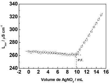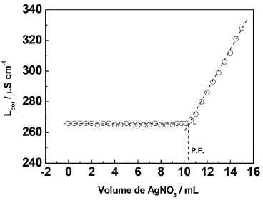 ![]() Figura 2. Titulaçao condutométrica de 100 mL da soluçao de NaCl 5,03 x 10-3 mol L-1 utilizando-se a soluçao estoque de AgNO3