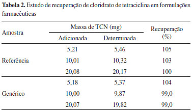 Estudos de repetitividade, interferentes e recuperaçao No estudo de repetitividade do procedimento condutométrico, uma soluçao de TCN 1,00 x 10-3 mol L-1 foi titulada por seis vezes (n = 6) com soluçao de AgNO3 1,02 x 10-2 mol L-1, obteve-se um coeficiente de variaçao de 0,64%. Nao foi realizado o estudo de interferentes, pois os excipientes (estearato de magnésio, amidoglicolato de sódio, laurilsulfato de sódio, crospovidona e talco) encontrados nas formulaçoes farmacêuticas contendo TCN sao insolúveis e/ou possuem baixa solubilidade, portanto, estes excipientes nao sao interferentes em potencial. No entanto, é importante ressaltar que sais de haletos sao interferentes em amostras contendo essas espécies químicas. O estudo de recuperaçao foi feito com três massas diferentes de padrao de TCN (≈ 5, 10 e 20 mg) adicionadas a duas amostras de formulaçoes farmacêuticas (referência e genérico) com dosagem de 500 mg de TCN por comprimido. Os resultados foram comparados com aqueles obtidos com as amostras nao fortificadas. Os resultados obtidos no estudo de recuperaçao sao apresentados na Tabela 2. Observa-se que as recuperaçoes variaram de 99,0 a 105%, confirmando que nao há interferência significativa da matriz (excipientes) nas amostras de formulaçoes farmacêuticas analisadas.