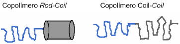 ![]() Figura 2. Copolímeros anfifílicos coil-coil e rod-coil. Blocos flexíveis repre sentados em linha e bloco rígido representado em cilindro. Blocos hidrofílicos representados em azul e blocos hidrofóbicos representados em cinza/preto