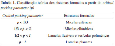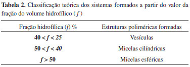 Para copolímeros com porçao hidrofílica formada por PEG, pode-se ainda inferir o tipo de agregado formado a partir do parâmetro f (0 < f < 1), que representa a fraçao de volume hidrofílico do copolímero e o qual pode ser convertido em porcentagem, a partir dos valores de massa das fraçoes, usando o valor da densidade dos homopolímeros (Tabela 2).45 A Figura 3 apresenta uma ilustraçao destes dois parâmetros que interferem na geometria das nanoestruturas e estao intimamente ligados.