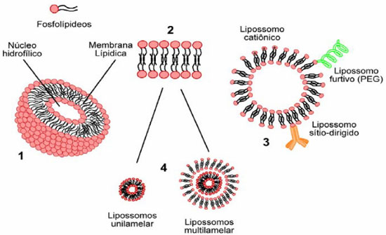 Figura 1. 1) Estrutura dos lipossomos constituídos por fosfolipídeos. 2) Bicamadas lipídicas. 3) Lipossomos com modificaçoes na superfície (peguilados, com carga e com anticorpos) 4) Tipos de lipossomos de acordo com o número de camadas