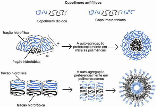 Figura 3. Representaçao esquemática da organizaçao geométrica de PL para um copolímero dibloco. De acordo com os tamanhos e proporçoes dos blocos hidrofílico e hidrofóbico, expressos matematicamente pela fraçao hidrofílica (f) ou pelo critical packing parameter (p), ocorre a agregaçao preferencialmente em micelas ou vesículas poliméricas (polimerossomos)