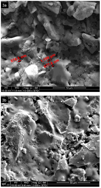 RESULTADOS E DISCUSSOES O resultado de (DRX) mostrou que a composiçao mineralógica da cerâmica é quartzo (SiO2) (60-70%) e gehlenita (Ca2Al(SiAl)O7) (32-40%), muito comuns neste tipo de cerâmica. Também foram encontradas pequenas quantidades de periclase (MgO) (~3%) e anortita (CaAl2Si2O8) (~3%). Esta composiçao mineral indica uma elevada temperatura de queima.5,7 As imagens obtidas pelo MEV estao mostradas nas Figuras 3. O fragmento sem consolidante (Figura 3a) exibe poros e vazios com grande variaçao de dimensoes, enquanto que o outro, com consolidante (Figura 3b), exibe uma agregaçao nao homogênea da soluçao com os poros e vazios parcialmente selados, o que mantêm a permeabilidade de sua superfície.5,8,9