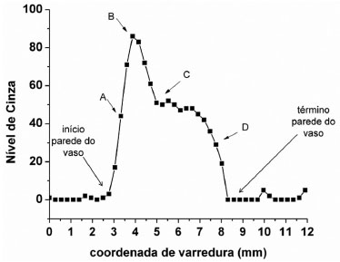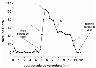 ![]() Figura 5. Distribuiçao típica dos níveis de cinza, ao longo da parede do vaso (da borda para o seu interior) mantido à umidade de 35%