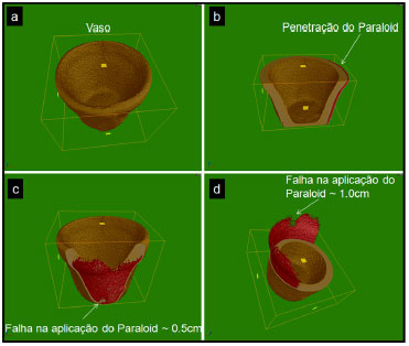 Com o intuito de complementar o estudo realizado, na Figura 7 estao apresentadas algumas imagens 3D da estrutura interna de um dos vasos tomografados, obtidas por meio do software VGStudio Max 2.2. Estas imagens referem-se ao vaso que foi mantido na umidade de 35% e permitiram uma visualizaçao macroscópica da distribuiçao do Paraloidr B-72 em suas paredes, e da profundidade de penetraçao.6 A Figura 7a mostra a imagem do vaso íntegro; a Figura 7b evidencia partes internas do material cerâmico, da qual foram removidas com as ferramentas de processamento do próprio software o topo e o lado frontal, de forma a permitir a visualizaçao da profundidade de penetraçao do Paraloidr B-72 (detalhe em vermelho), bem como a fronteira cerâmica/Paraloid; as Figuras 7c e 7d expoem partes do corpo cerâmico e do consolidante no interior da cerâmica, o que permitiu a visualizaçao de duas falhas (indicadas por setas) com tamanho considerável, do processo de impregnaçao do consolidante.
