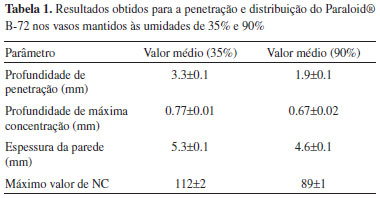 Para o vaso mantido à umidade de 90%, a irradiaçao foi realizada seguindo os mesmos procedimentos empregados para o mantido a 35%, e uma distribuiçao típica é mostrada na Figura 6. A Tabela 1 resume todos os valores obtidos para a penetraçao e distribuiçao do Paraloidr B-72 para ambos os vasos estudados.