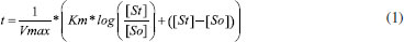 Avaliou-se o melhor modelo comparando-se os resultados obtidos e o erro inerente a cada um, bem como a magnitude dos parâmetros cinéticos encontrados na ausência dos compostos fenólicos. Pelos dados da Tabela 1, pode-se verificar que o modelo de inibiçao competitiva foi o que melhor se ajustou aos dados. Uma sobreposiçao dos valores teóricos desse modelo aos dados está representada na Figura 2.