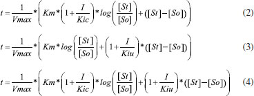 A inibiçao da enzima pelos polifenóis foi dependente da temperatura a um valor ótimo de 323 K, embora apenas o ácido clorogênico tenha sido capaz de inibir a enzima em 298 K. Ajustes nao lineares das equaçoes 2, 3 e 4 aos dados experimentais a 323 K foram realizados, e os resultados estao representados na Tabela 1.