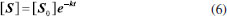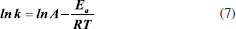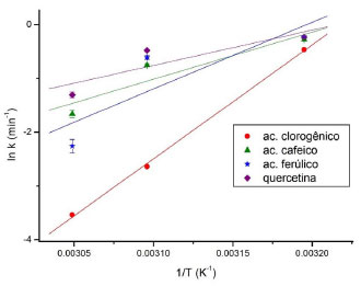 Efeito da temperatura Os dados cinéticos obtidos também podem ser representados por um decaimento exponencial de 1ª ordem, obtido pela lei de velocidade integradas, como dado pela Equaçao 6 a seguir.20 ![]() A partir da equaçao 6 realizou-se um ajuste exponencial de 1ª ordem aos dados experimentais a fim de se obter a constante de velocidade (k). A partir do valor de "k", pode-se analisar a dependência da velocidade de reaçao com a temperatura pela relaçao de Arrhenius.20 ![]() Em que k representa a constante de velocidade, A a constante pré-exponencial ou fator de frequência, Ea a energia de ativaçao, R a constante dos gases (8,314 J K-1 mol-1) e T a temperatura. Os resultados apresentados na Figura 3 reforçam a complexaçao com ácido clorogênico como a mais sensível à temperatura entre as testadas.
