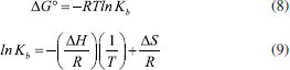 Esses resultados mostram uma tendência linear com a concentraçao dos polifenóis, sugerindo um comportamento estático (interaçao) ou dinâmico (colisional) para a extinçao observada. Embora essa distinçao possa ser apenas comprovada fluorimetricamente por determinaçao da constante de tempo de vida do fluoróforo (τ0) em diferentes temperaturas,15 o potencial inibitório dos polifenóis atesta o caráter estático do fenômeno. Utilizando dados obtidos para a constante de interaçao dos complexos (Kb) em diferentes temperaturas, os parâmetros termodinâmicos foram calculados a partir da equaçao 8 para energia de Gibbs (ΔG) e equaçao 9 de Van't Hoff para a variaçao da entalpia (ΔH) e variaçao da entropia (ΔS).16 Os dados estao representados na Tabela 3. ![]()