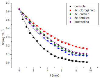 ![]() Figura 2. Ajuste nao linear dos dados de inibiçao dos compostos fenólicos (ácido clorogênico, ácido cafeico, ácido ferúlico e quercetina) sobre a catálise de amido por α-amilase em pH 5,9 a 323 K para determinaçao de valor do Kic