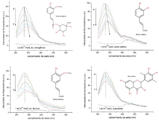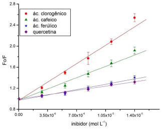 Em todos os espectrofluorogramas apresentados na Figura 4, a intensidade de fluorescência da α-amilase sofreu uma gradual diminuiçao com o aumento da concentraçao de ligante. A elevada diminuiçao da intensidade fluorescência sugere que ocorreu a formaçao de complexos entre eles,23 o que é corroborado pelos resultados de inibiçao da enzima. Nota-se que houve um deslocamento batocrômico (red shift) do espectro de fluorescência do complexo formado indicado pelas setas da figura 3 para a interaçao com ácido clorogênico e/ou ácido cafeico com a enzima. O red shift do comprimento de onda de emissao máxima de 334 para 348 nm da α-amilase na presença de ácido clorogênico e de 334 para 342 nm da α-amilase na presença de ácido cafeico, respectivamente, pode caracterizar um aumento da polaridade (ou uma diminuiçao da hidrofobicidade) na regiao vizinha ao sítio de triptofano, sugerindo uma transiçao conformacional na enzima.24 Contrariamente, nao foi verificado nenhum desvio para a interaçao de α-amilase na presença de ácido ferúlico ou quercetina. Embora seja especulativo, ambas as estruturas apresentam uma maior característica hidrofóbica (grupo metileno no ácido ferúlico e maior superfície apolar na quercetina) quando comparado aos demais testados, o que pode relacionar-se com uma menor energia de ligaçao com a enzima. O efeito da interaçao entre a α-amilase e os ligantes foi quantitativamente abordado pela equaçao 5 de Stern-Volmer, e está representado na Figura 5.