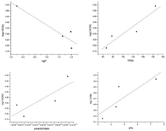 ![]() Figura 6. Relaçao de parâmetros encontrados nos ensaios de cinética e equilíbrio (IC50 e Kb) com descritores reportados para os polifenóis