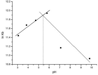 ![]() Figura 7. Interaçao de α-amilase com ácido clorogênico em 323 K sob variaçao de pH