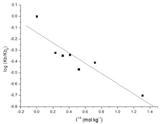 A Figura 7 apresenta dois comportamentos lineares para a constante Kb em funçao do pH. Extrapolando-se linhas retas a partir desses resultados obtêm-se uma intersecçao a 5,5 no eixo das abscissas coincidente com a faixa de pKa para His livre (5,6 a 7,0),14 e reforçando-se a hipótese sugerida. De fato, a enzima possui três resíduos de His nos subsítios catalíticos, His 80, His 122 e His 210, todos envolvidos em ligaçoes de hidrogênio com o substrato em pH 7,5.21 No presente trabalho, os ensaios realizados em pH 5,9 sugerem a existência de uma populaçao mínima de espécies carregadas positivamente para esses resíduos. Complementarmente, a Figura 6 sugere que a ligaçao de maior estabilidade com a enzima (Kb) ocorreu para o ligante com maior intervalo entre o valor de pKa e o pH dos ensaios. Os resultados obtidos da titulaçao espectrofluorimétrica de ácido clorogênico sob variaçao de força iônica (Figura 8) mostraram uma relaçao inversa na qual a estabilidade do complexo reduz em funçao do teor salino.31 O gradiente negativo resultante do efeito da adiçao do sal neutro na interaçao ligante-proteína indica que os íons reagentes (ligante e proteína) exibem sinais contrários, reforçando a hipótese de estabilizaçao dos complexos por interaçao eletrostática do carboxilato do ácido clorogênico à proteína. Como a enzima apresenta um valor de ponto isoelétrico (pI) em torno de 4,5,32 o pH 5,9 utilizado nos ensaios implica que a mesma se apresentou na forma aniônica.33 De fato, utilizando-se uma calculadora virtual de propriedades físico-químicas para a sequência primária da enzima (Innovagen, http://www.pepcalc.com),22 foi contabilizado o valor de -14 para a rede de carga líquida da enzima no pH 5,9 do ensaio, e valor de pI de 4,15. Entretanto, sao encontrados em torno dos subsítios de catálise da enzima seis resíduos de aminoácidos básicos (Arg, Lys e His) e apenas dois resíduos ácidos (Asp),21 o que pode contribuir para a interaçao do carboxilato do ácido clorogênico, tendo em vista os valores de pK das cadeias laterais dos aminoácidos livres de 9,4 para Lys (ε-amino) e de 12,1 para Arg (grupo guanidínio).14 Esse dado também apoia a possibilidade de interaçao do ligante ionizado com aminas imidazólicas de resíduos de His nos subsítios catalíticos da enzima (His 80, His 122 e His 210).21