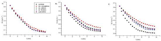 Figura 1. Inibiçao enzimática de compostos fenólicos a 2,8 x10-5 mol L-1 sobre α-amilase. A - 298 K, B - 313 K, Figura C - 323 K