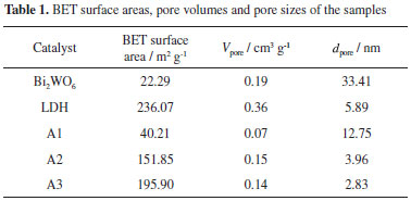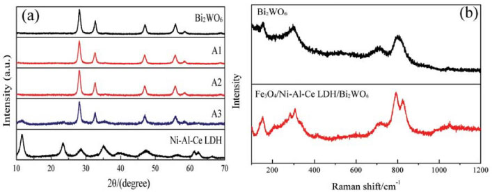 RESULTS AND DISCUSSION The X-ray diffraction patterns of Bi2WO6, Fe3O4/Ni-Al-Ce LDH and a series of Fe3O4/Ni-Al-Ce LDH/Bi2WO6 composites are shown in Figure 1(a). The pure Bi2WO6 sample has four peaks, corresponding to the orthorhombic phase of Bi2WO6 (JCPDS No. 73-1126).26,27 The peaks of the Ni-Al-Ce LDH sample are also similar to previous research.28 From Figure 1(a), we also find that the major peaks of the composites (A1, A2 and A3) are in agreement with those of pure Bi2WO6. This is because the amounts of LDH in the composites are very small. However, as the LDH content is increased, the characteristic peaks of the LDH at 11.5° and 35° are observed. Therefore, this proves that the series of Fe3O4/Ni-Al-Ce LDH/Bi2WO6 composites were successfully synthesized. Figure 1(b) shows the Raman spectra of the synthesized samples. For pure Bi2WO6, the peaks at 600-1000 cm-1 can be assigned to the stretching vibration of W-O.29 The band at 310 cm-1 can be assigned to translational modes involving the simultaneous motions of Bi3+and WO66-.30 Additionally, the peaks at 700 and 790 cm-1 are interpreted as the antisymmetric bridging mode associated with the tungstate chain and the antisymmetric Ag mode of the terminal O-W-O groups, respectively.31 Compared with pure Bi2WO6, the intensities of the peaks of the composites obviously changed. The intensities of the peaks at 850 and 310 cm-1 increased, which might be attributed to some of the atoms of the LDH being doped into the O-W-O lattice.3 This result further testifies that the novel composite was synthesized successfully.