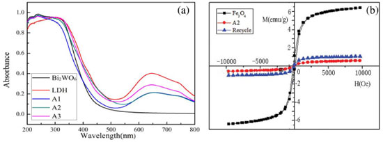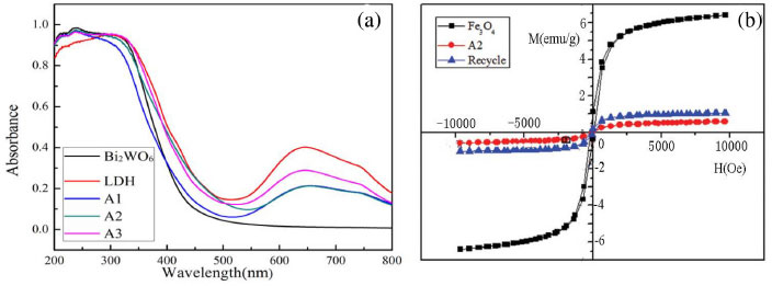 Figure 2. (a) UV-vis diffuse reflectance spectra of the samples; (b) the magnetization curves of Fe3O4, A2 and the recycled catalyst
