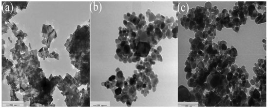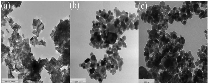 The band gaps of the different samples decreased in the following order: Fe3O4/Ni-Al-Ce LDH (2.62 eV) < A3 (2.64) < A2 (2.68) < A1 (2.71) < Bi2WO6 (2.86 eV). The presence of Fe3O4/Ni-Al-Ce LDH is beneficial for reducing the band gap of Fe3O4/Ni-Al-Ce LDH/Bi2WO6. The band gap narrowing of the composite is possibly attributed to the formation of a core-shell structure, which builds a new molecular orbital and narrows the band gap. According to the UV-vis results, we can make the reasonable assumption that the Fe3O4/Ni-Al-Ce LDH/Bi2WO6 composite could enhance the photocatalytic activity under visible-light irradiation. From Figure 2(b), we find that the samples have less coercivity and remanence, indicating that the catalysts have good superparamagnetism.34 The magnetic saturation (1.2 emu g-1) of A2 is lower than that of Fe3O4 (6.8 emu g-1). The possible reasons for this are that the content of Fe3O4 in the composite is too little and that the surface of Fe3O4 is covered by Ni-Al-Ce LDH. From Figure 2(b), we can also find that the magnetic saturation of the recycled catalyst decreases, but it still possesses magnetism. Hence, we can draw a conclusion that a magnetic material is synthesized, and it is useful for recycling and reusing. The morphologies and structures of Bi2WO6 and the Fe3O4/Ni-Al-Ce LDH/Bi2WO6 composite were observed by TEM, and the images are shown in Figure 3. From Figure 3(a), we see that the pure Bi2WO6 particles exhibit a distinct sheet structure. In addition, the morphology of the composite is shown in Figure 3(b) and 3(c). The core-shell structure of the composite was formed between the Bi2WO6 and Fe3O4 coating with the Ni-Al-Ce LDHs. This is benefit to the separation of photogenerated electrons and holes.