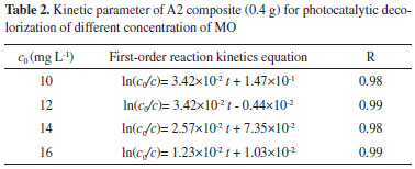 We also calculated the decolorization rate constants k for various samples, and the results are shown in Figure 4(b). The k values of the composite materials (A1, A2 and A3) are higher than pure Bi2WO6 and the LDH, and the A2 composite exhibited the maximum k value. This result indicates that A2 possesses higher photocatalytic activity. This may be attributed to the larger specific surface area and appropriate pore volume of the A2 composite, which provides more active sites. This result further illustrates that the composite materials possess preferable photocatalytic activities. To evaluate the reusability of the prepared composite during the photocatalytic reaction, recycling experiments were carried out under visible-light irradiation. As shown in Figure 4(c), the composite shows better stability, and the decolorization efficiency of the composite material remained at 71% after the fourth recycling run. Because the synthesized composites possess magnetization, this is beneficial for recycling and reusing. To explore the photocatalytic performance of the material, degradation experiments were carried out with different concentrations of MO. In addition, the first-order reaction rate equations are shown in Table 2, indicating that the photocatalytic process of MO decolorization conforms to first-order kinetics.38,39 From Table 2, we find that the reaction rate constant decreased as the methyl orange concentration increased. As is well-know, physical interpretation of reaction rate constant is reaction rate of unit concentration (1 mol L-1). Under visible light irradiation, photocatalyst was excited and produce photogenerated electron-hole pairs. Photogenerated electrons and holes can react with reactant directly or form stronger reactive species react with reactant, so as to achieve the purpose of the degradation of organic pollutants. Therefore, photocatalytic reaction rate depends on the amount of catalyst. When the concentration of reactant increased and the mass of the photocatalyst was constant, unit concentration corresponding to the amount of photocatalyst reduced. However, the mass of catalyst is critical for photocatalytic reaction rate. Hence, the reaction rate decreased and the rate constant decreased.