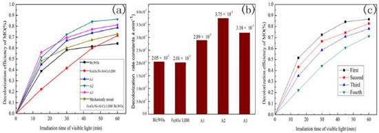 CONCLUSIONS Novel Fe3O4/Ni-Al-Ce LDH/Bi2WO6 composites were synthesized successfully via a low-temperature hydrothermal method and co-precipitation process. The photocatalytic activities of the Fe3O4/Ni-Al-Ce LDH/Bi2WO6 composites were tested using the degradation of an organic dye under visible-light illumination. The results showed that the A2 composite exhibited significantly enhanced performance in the photocatalytic reaction. In addition, after the fourth recycling run, it still maintained higher photocatalytic activity. Therefore, the Fe3O4/Ni-Al-Ce LDH/Bi2WO6 composite material is a catalyst with high activity and stability. The discovery of novel catalysts not only provides a new route for preparing heterojunction photocatalysts but also provides a possible method for the development of wastewater treatment.
