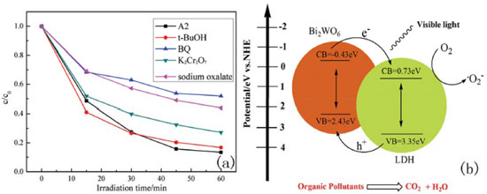 Based on the above results, we suggest a possible photocatalytic reaction mechanism, which is explained in Figure 5(b). From the picture, we see that the CB position of Bi2WO6 is set at -0.43 eV is more negative than that of the LDH (0.73 eV). Therefore, the electrons in the CB of Bi2WO6 will transfer to the CB of the LDH.43 In addition, the VB of the LDH (3.35 eV) is more positive than LDH, and the holes of LDH will migrate to Bi2WO6.44 This process is beneficial for separating the photogeneration electron-hole pairs and prolonging the lifetime of the charge carriers.45,46 The electrons on the Bi2WO6 surface can react with dissolved oxygen to form superoxide radicals, owing to its more negative CB position.20 In addition, the process of the photocatalytic reaction can generate strong oxidative species, such as •OH, H2O2 and O3. The reason for this is that the potentials of the holes are much more positive than the standard redox potentials of •OH/OH- (1.99 eV vs NHE), H2O2 (1.77 eV vs NHE), and O3 (2.07 eV vs NHE).35, 36 These reactive species have higher responses for the photocatalytic reaction.