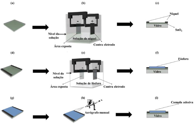 Figura 1. Ilustra o processo de obtençao da tela de fósforo: a) Substrato de vidro recoberto com SnO2; b) eletrodeposiçao de níqueld) substrato de vidro recoberto com SnO2 e níquel; e) deposiçao eletroforética; g) substrato de vidro recoberto com SnO2, níquel e fósforo; h) deposiçao da camada adesiva por spray; c), f) e i) apresentam o perfil das camadas depositadas