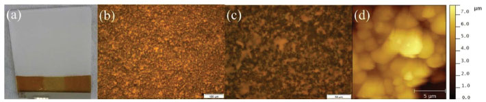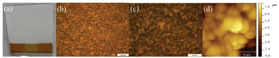 Figura 2. Imagens da tela de fósforo azul com dimensoes de 70 mm x 50 mm x 1,2 mm: a) foto da tela de fósforo; b) e c) imagens da microscopia óptica onde se observam pontos com maior concentraçao de partículas de fósforo e d) imagem de microscopia de força atômica