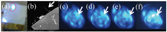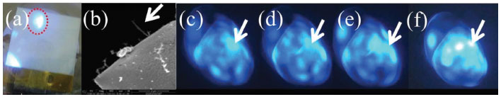 Figura 3. Imagens do sistema FEM: a) tela de fósforo projetando imagens da emissao de elétrons dos nanotubos de carbono; b) microscopia eletrônica de varredura (MEV) do CNT que está emitindo; (c) a (f) detalhes dos pontos de adsorçao de gases que se movimentam durante a aquisiçao das imagens por FEM. A tensao utilizada para emissao foi de aproximadamente 800VDC